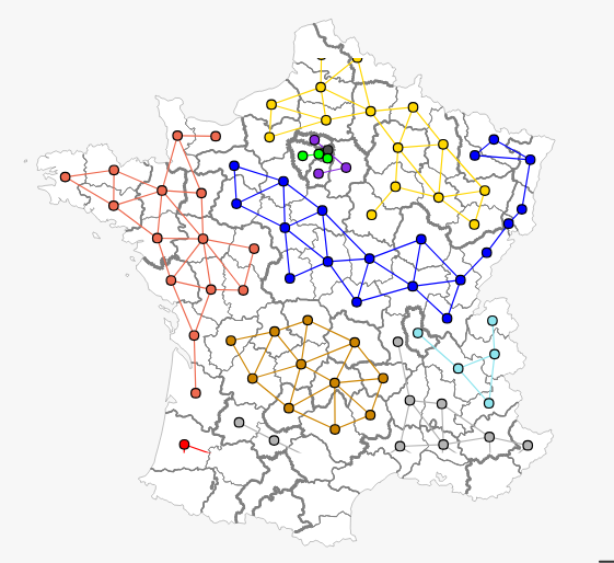 La combinaison des méthodes de classification et de régionalisation est facilitée par le développement d’une nouvelle fonction du package ‘adespatial‘ qui permet de regrouper les unités spatiales les plus ressemblantes en respectant la contrainte de connexité. Mise au point par des écologues canadiens, cette méthode de classification ascendante hiérarchique avec contrainte de voisinage est beaucoup plus simple d’emploi et efficace que les autres méthodes de régionalisation disponibles actuellement dans des packages tels que ‘rgeoda‘. Elle s’appuie sur un corpus théorique d’analyse spatiale de la biodiversité des espaces animale ou végétale que l’on peut tenter de transposer à de nombreux problèmes géographiques, mais en adoptant une posture critique dans le cas de thématiques éloignées des questions de biologie végétale. Nous prenons ici comme exemple l’analyse du résultat des élections européennes de 2024 en France métropolitaine à trois niveaux d’agrégation : régions administratives, départements et circonscriptions législatives. Nous comparons à chaque échelle les résultats des méthodes de régionalisation et classification, et nous discutons leurs apports respectifs pour la compréhension des phénomènes de géographie électorale.Grasland, Claude (2025). Classification et régionalisation. Rzine. https://doi.org/10.48645/r6ng-wz66.