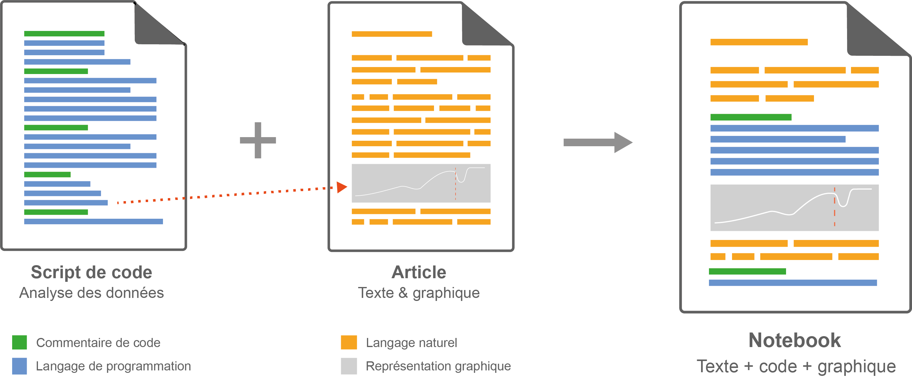 Ils permettent de combiner des sections en langage naturel et des sections en langage informatique. Le notebook permet ainsi d’appliquer correctement le paradigme de la programmation lettrée préconisé par Donald Knuth dans les années 1970 pour répondre aux enjeux de la recherche reproductible. .